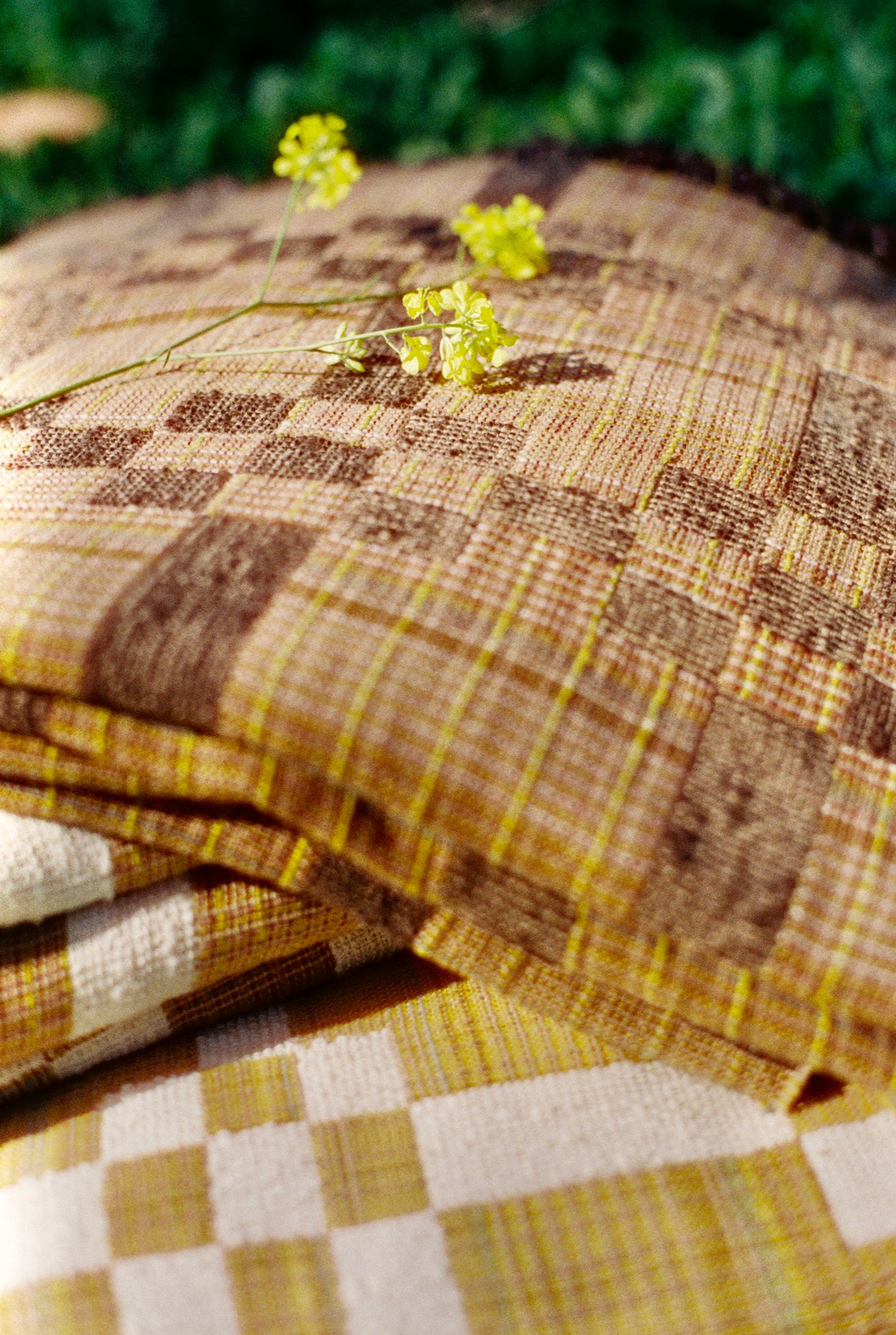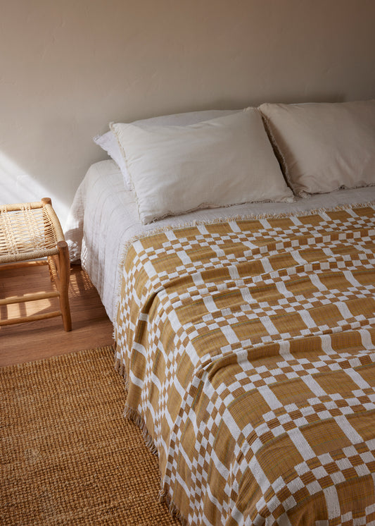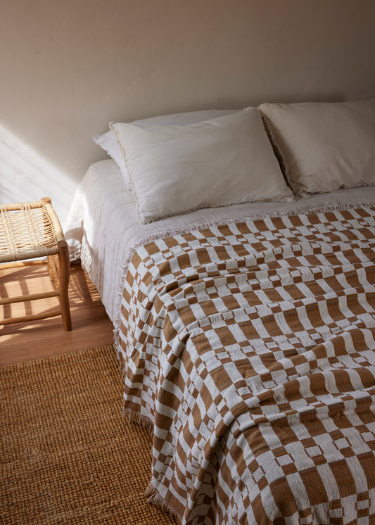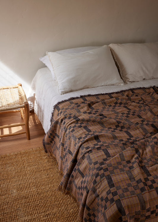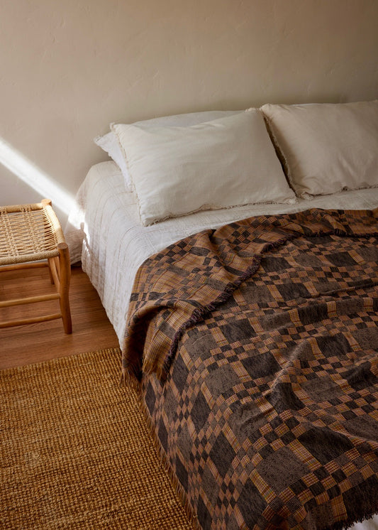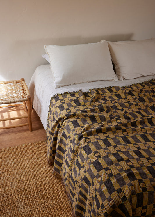 Each blanket is crafted using a double weave construction, meaning two layers of fabric are woven in tandem, connected at certain points to create a lightweight, cozy quilted texture.