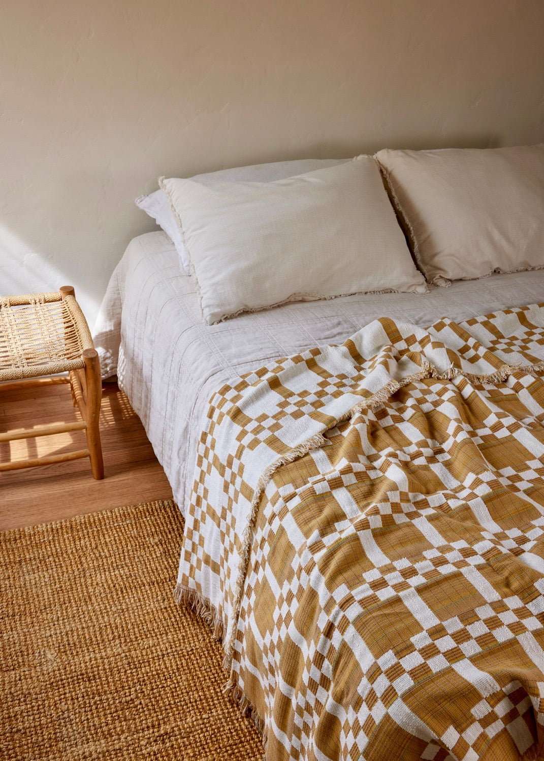 Each design is crafted by our founder Anna in Los Angeles, inspired by global textile traditions.  Created with versatility in mind, these textiles can be used in both traditional and modern settings. They are woven on a dobby loom by a women-run mill in Bristol, England.
