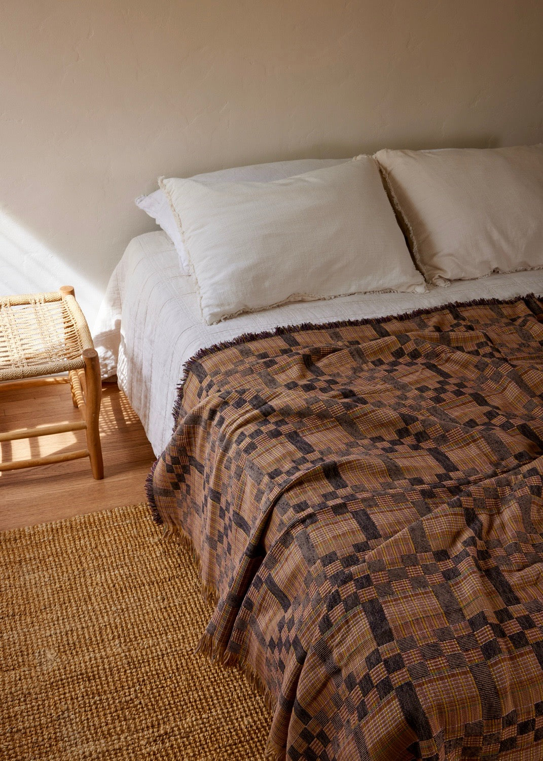 This oversized throw is our most versatile blanket—perfect for sofa snuggles, folded over on a twin bed, and wide enough to be draped across the foot of a queen or king sized bed. Our throw blankets are crafted using a double weave construction, meaning two layers of fabric are woven in tandem, connected at certain points to create a lightweight, cozy quilted texture.